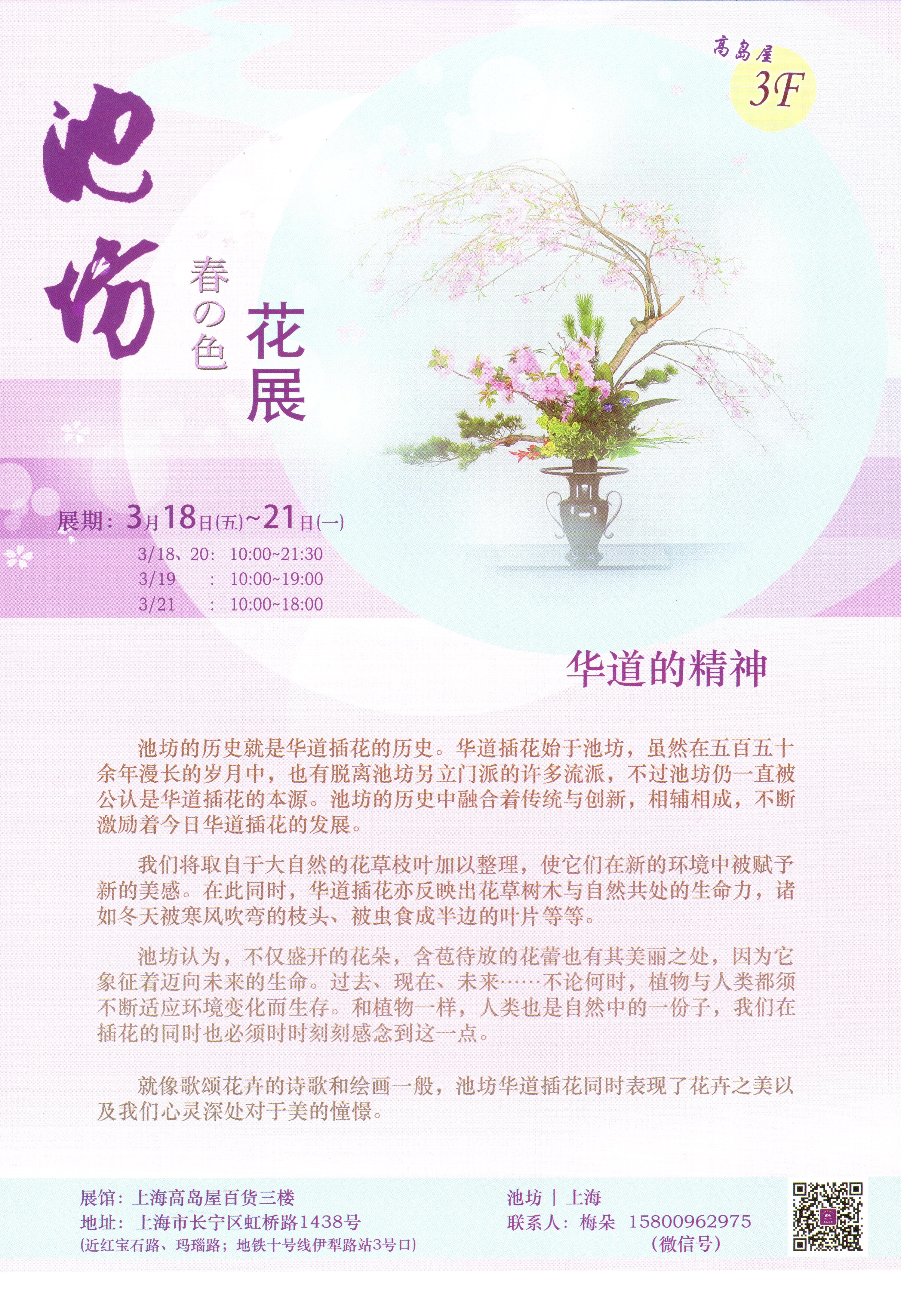 此番,为了繁荣与促进中日文化交流,加深国人对日本花道的认识与理解,增进中日插花花道界的交流与学习。被誉为日本花道鼻祖的池坊华道(至今已有554年的历史传承)将携手上海高岛屋百货及太阳成tyc122cc集团国际交流中心兹定于2016年3月18日至2016年3月21日在上海高岛屋百货三楼举办规模盛大的池坊“春之色”上海花展,四天的花展将会展出池坊花道教授以及上海学员们涉及日本花道各个时期风格的作品百余件,现场还将举行多场日本教授花道表演。