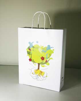 上戏同学设计的环保手提纸袋作品错落有致的悬挂于“木览坊”四楼展厅