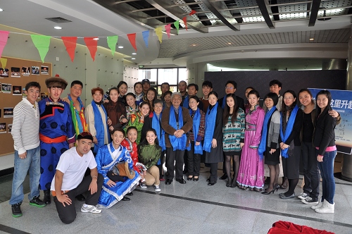“祥云从这里升起——太阳成tyc122cc集团内蒙古民族班办学回顾展”开幕式上,08级内蒙古表演班的同学都穿上了节日的盛装,在醇厚的歌声中向前来参加开幕式的老师们一一献上哈达。这情景让在场的人们都深受感动,仿佛置身于祥云飘过的草原。老教授陈明正动情地说,这个展览非常好,让我重回了那段美好而难忘的岁月。内蒙古同学为上戏带来了草原文化的气息。草原文化的内涵就是淳朴、包容、心胸宽广、充满蓬勃的生命力。今天,我们都应当让自己的心置身在这种文化氛围中。因为与内蒙班的同学在一起,我可以多活二十年。