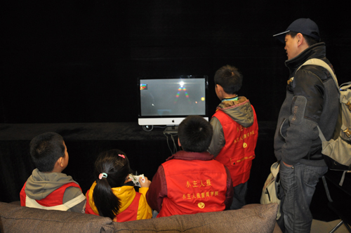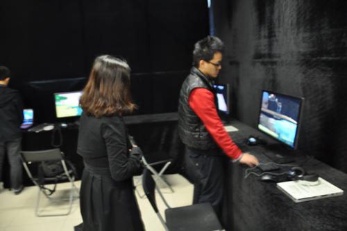早上九点,我班的志愿者都准时守在了会展地点,展览刚刚开始,就有很多人来参观。有些事情真的是体会过了才知道其中的不易。我们会被问到很多简单或有难度的问题,比如这个展览展的是什么,是哪里的作品。这些我们之前做过准备所以不成问题。但也有很多专业人士会来问我们诸如这个游戏的开发时间多长等此类比较专业的问题,有时也会把我们难倒。总之还不错,同学们热情高涨,基本能令来的每一个人都笑盈盈的走出展览会场。我们不仅要解答参观者的问题,同时我们也要陪着来的参观者玩游戏,因为有两款游戏都需要两个人配合着一起玩儿,半天下来,我们已经对游戏了如指掌了。