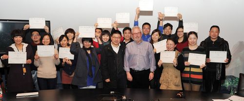 图为黄昌勇副经理和英国NFA国际艺术机构联合创始人罗杰•麦克凯恩为学员们颁发结业证书