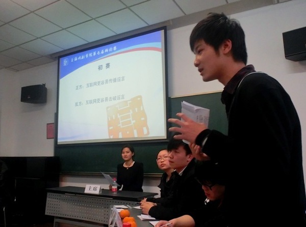 下午3:30,创意公司与舞美系代表队之间的第二场辩论在红楼212教室激情开辩。初赛辩题为“网络与谣言”,创意公司持正方观点:“互联网更容易传播谣言”,舞美系代表队持反方观点为:“互联网更容易击破谣言”。双方辩手经过一辩陈述、二三辩攻辩、自由辩论和四辩总结陈述等几轮的“攻守厮杀”,难分上下,两院系“后援团”同学各展风采,充分表现了上戏员工“积极向上,努力求是”的精神。