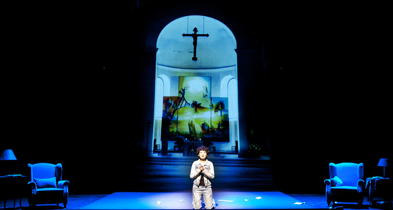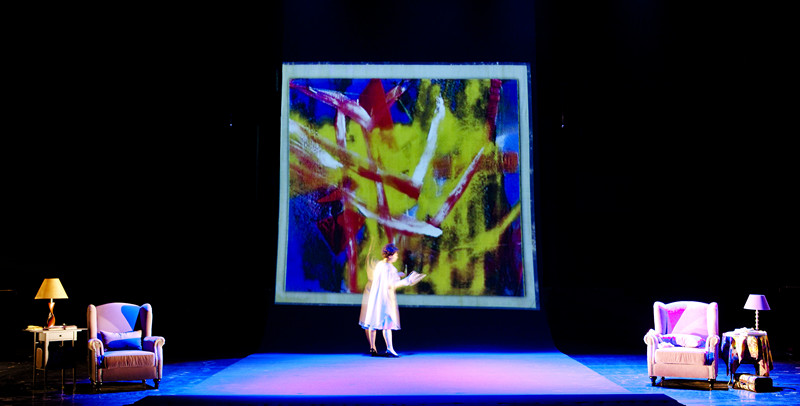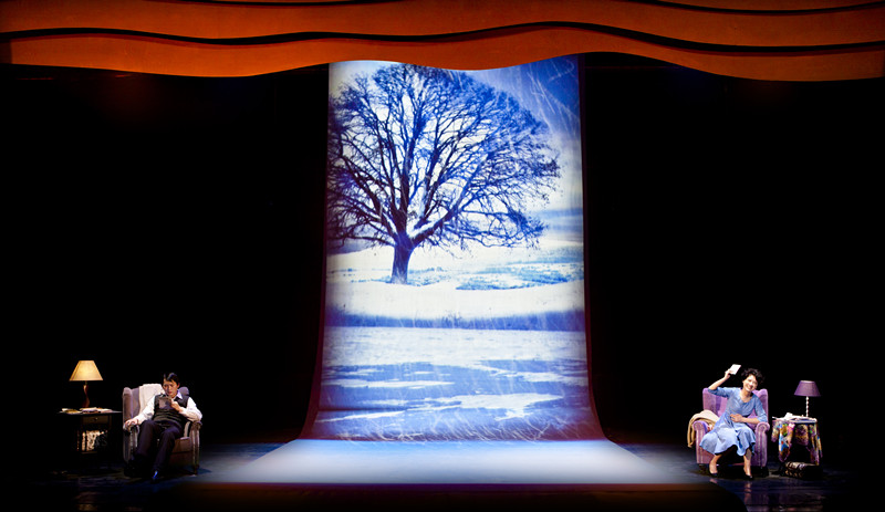 新媒体舞台剧《爱情书简》融入舞台演出的新媒体语汇,将男女主人公半个世纪的情感进行了更为诗化的演绎,不仅拓展了时空,更使时空的变换转化为一种促使人们思考的力量。在数字化时代没有到来之前,为了克服距离的阻隔,书信往来成为人们仅有的沟通手段。人们在沟通载体中所呈现的自我究竟是真实的还是虚幻的,这一困扰着男女主人公同时又让他们感到迷恋的问题,同样质问着信息化时代的人们。因此,以新媒体方式来呈现“书信”这样一种最古老、最传统的沟通手段,成为一个颇具创意的“错位”。