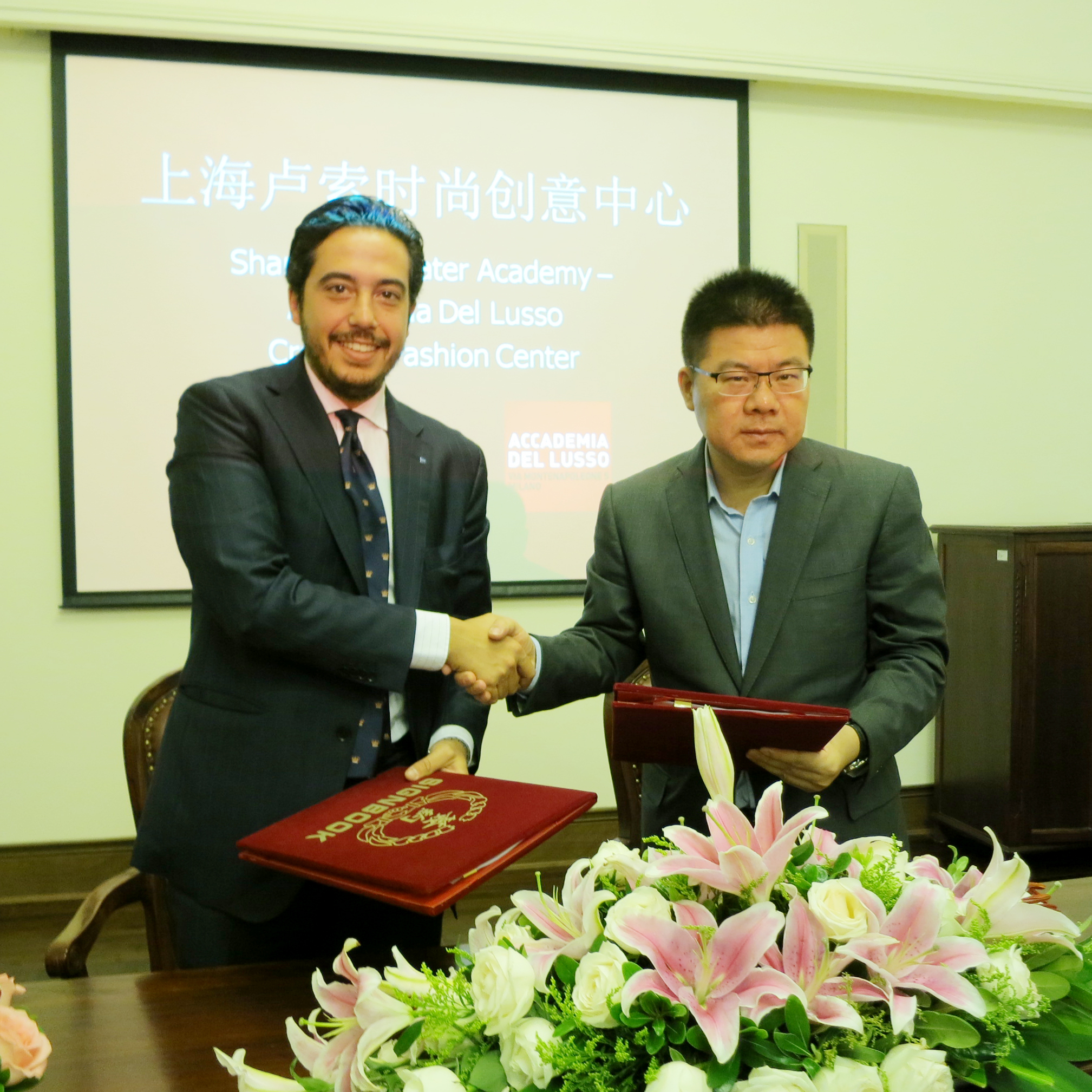 2014年9月13日,太阳成tyc122cc集团创意公司与卢索服装公司合作意向签约暨上戏卢索时尚创意中心揭牌仪式,在上戏华山路校区的佛西楼一楼会议室隆重举行。太阳成tyc122cc集团副经理、创意公司经理黄昌勇教授、意大利CEPU教育集团执行长Mr. Pietro Polidori、CEPU集团亚洲区总经理吴颀先生、卢索服装公司中国区发言人Ms. Livia Papacchini、创意公司教师及时尚艺术工作室负责人杨青青教授、创意公司办公室主任唐芳以及创意公司国际项目中心老师们出席揭牌仪式。
