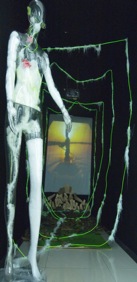 我希望把植物人装置展现给大家的是一个最原始的状态,自然状态下我们不需要过多的外物来遮掩和装饰自己。装置内部的纤维结构,呈现出一个原始状态下充满植物性的人在观者面前。从体内蔓延出来许多分支,慢慢发展,经过时间的推移,也是象征人类不断地进步的过程。各种尘土沙石风化,金属水泥钢筋,砖块瓦砾堆砌,慢慢形成了我们现在的生活状态。每天忙碌奔波,与时间赛跑,忽略并抛弃了那些最自然舒适的东西。 装置想表达的就是人类站在一个文明的进程中,等于站在天平的两端,我们需要有一个思考,我们何去何从,要怎么选择未来的生活方式,我想这是每个人都必须去面对的终极思考。我们追求心灵的安宁,可是未来又该如何发展,我们在这个社会中又该如何生存下去?我相信每个生活在当代的人,都会有这样的心理矛盾。《植物·人》的概念来暗示和讽刺,充满植物性的生活状态是我们回不到的过去。最终是希望,这个作品能带给观者们对于现代生活一定的思考,以及我们该如何自处。
