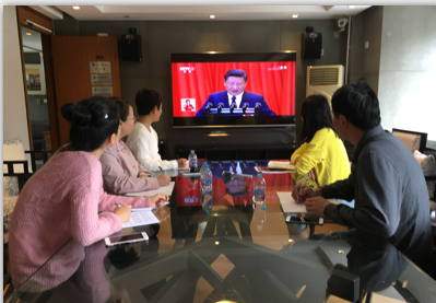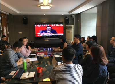 10月18日,十九大开幕的当天早上,创意公司党支部便按照公司党委的部署将党员教职工聚集在一起,认真收看电视直播的大会盛况。长达三个多小时的时间里,大家边观看边议论,报告中出现的新观点、新论述、新提法,都不时引起热烈的反响。支部里两位分别在国外和外地访学的党员教师,也通过网络直播收看了大会开幕式。教师中的入党积极分子有的来到会议室与党员们一起收看,有的在直播结束后主动支部负责人发来短信,畅谈自己的直观感受。