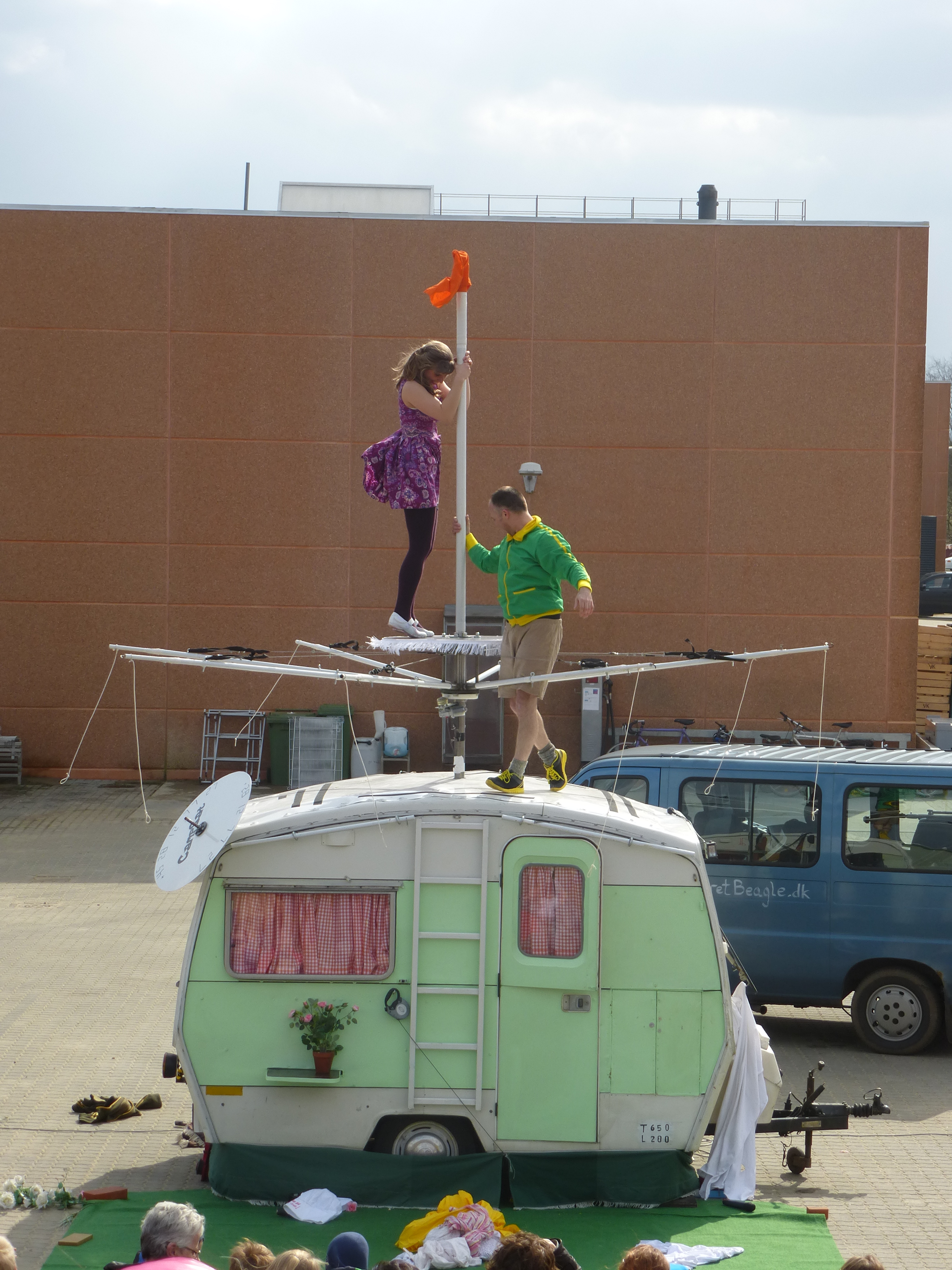 午后的摩斯岛阳光明媚,蓝天白云,海风吹过,牛奶工厂旁边的小山坡上绿草青翠。坐垫会发给每一个前来观剧的人,用以坐在三十度到四十五度之间的山坡上悠闲地观剧,并隔开偶尔可能会潮湿的草地。前方远处是大大的牛奶工厂,左右两边有工厂的小型货车和大型奔驰货车。就在这样的环境(Theatre Beagle)之中,上演了一部精彩的街头戏剧——《The Campers》。它由一个女演员和两个男演员的表演,通过生活在一个营地的一个荒谬的旋转木马展示出被淹没的生活和超现实的挑战。它是适合所有年龄段的国际观众的非语言的街头戏剧,快节奏的形体剧场是一种简单的快乐。(12艺管 文/图:马艺彤  编辑:黄思梦 )