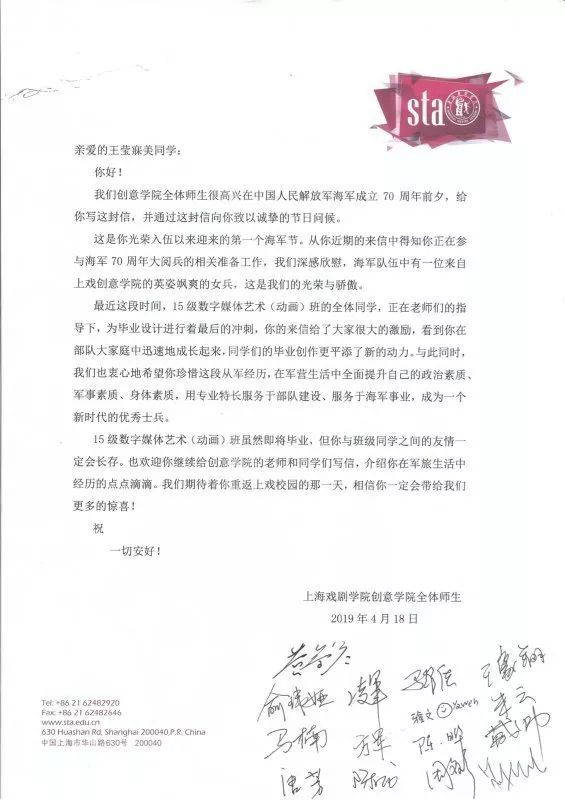 这是你光荣入伍以来迎来的第一个海军节。从你近期的来信中得知你正在参与海军70周年大阅兵的相关准备工作,我们深感欣慰,海军队伍中有一位来自上戏创意公司的英姿飒爽的女兵,这是我们的光荣与骄傲。