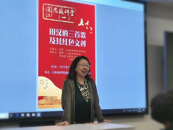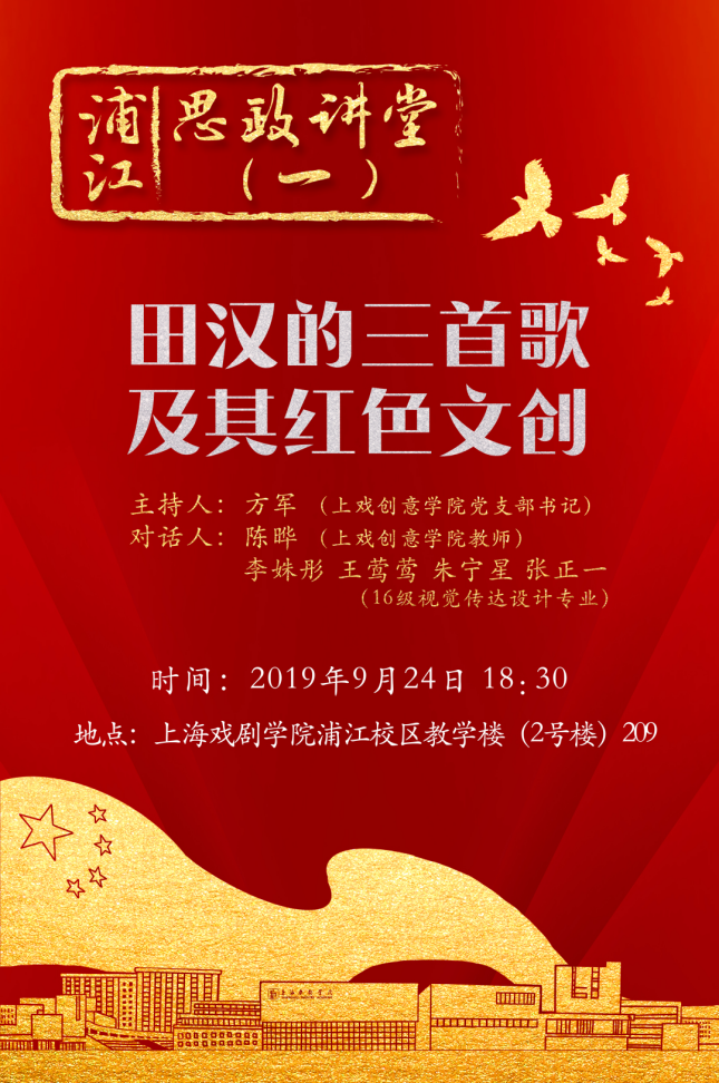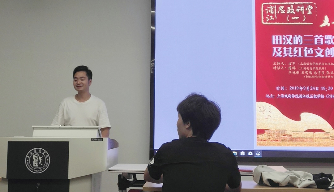 924日晚,创意公司党支部书记方军,视觉传达设计专业教师陈晔,辅导员陈龙,16级视觉传达设计专业员工李姝彤、王莺莺、朱宁星、张正一,17级数字媒体艺术专业员工程宇硕等在浦江校区,为19级数字媒体艺术、艺术管理两个专业的同学带来了“浦江思政讲堂”第一讲,主题是《田汉的三首歌及其红色文创》。
