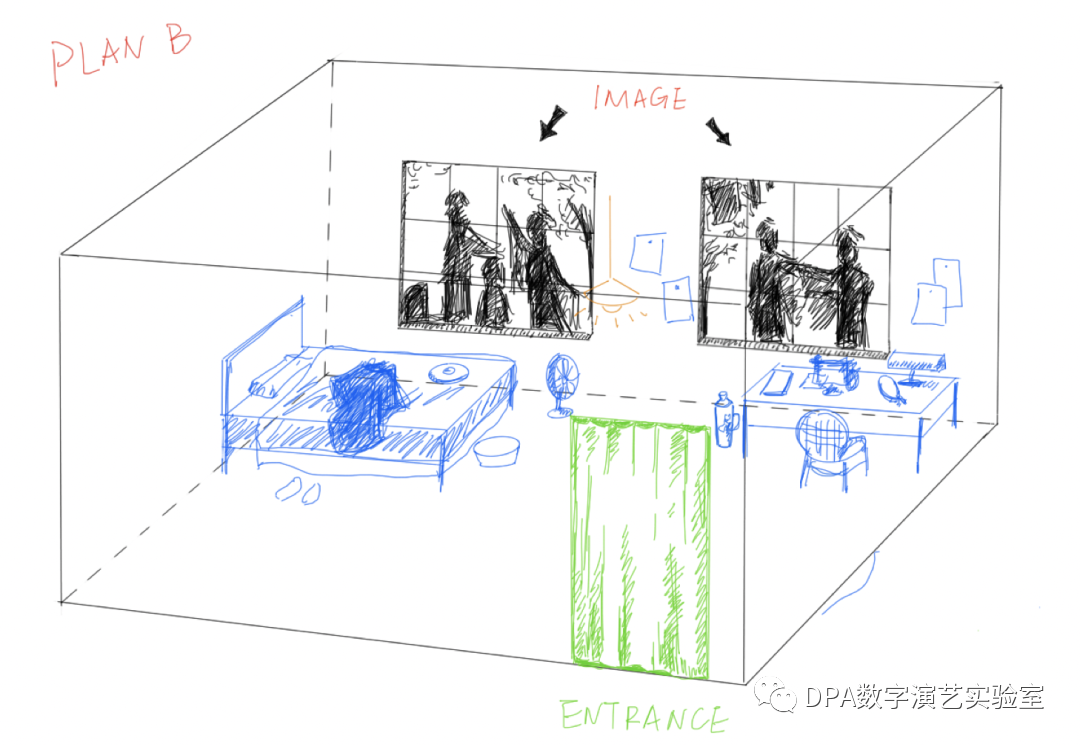 通过KINNECT设备获取观众的实时位置与动作,并通过Touch Designer后台程序实时的进行处理,并投射在墙面上。加大观众的参与性,呈现与虚拟演员对话的视觉效果。并通过观众的介入来触发虚拟影像内容的呈现,带给观众“穿越”时间的错觉。