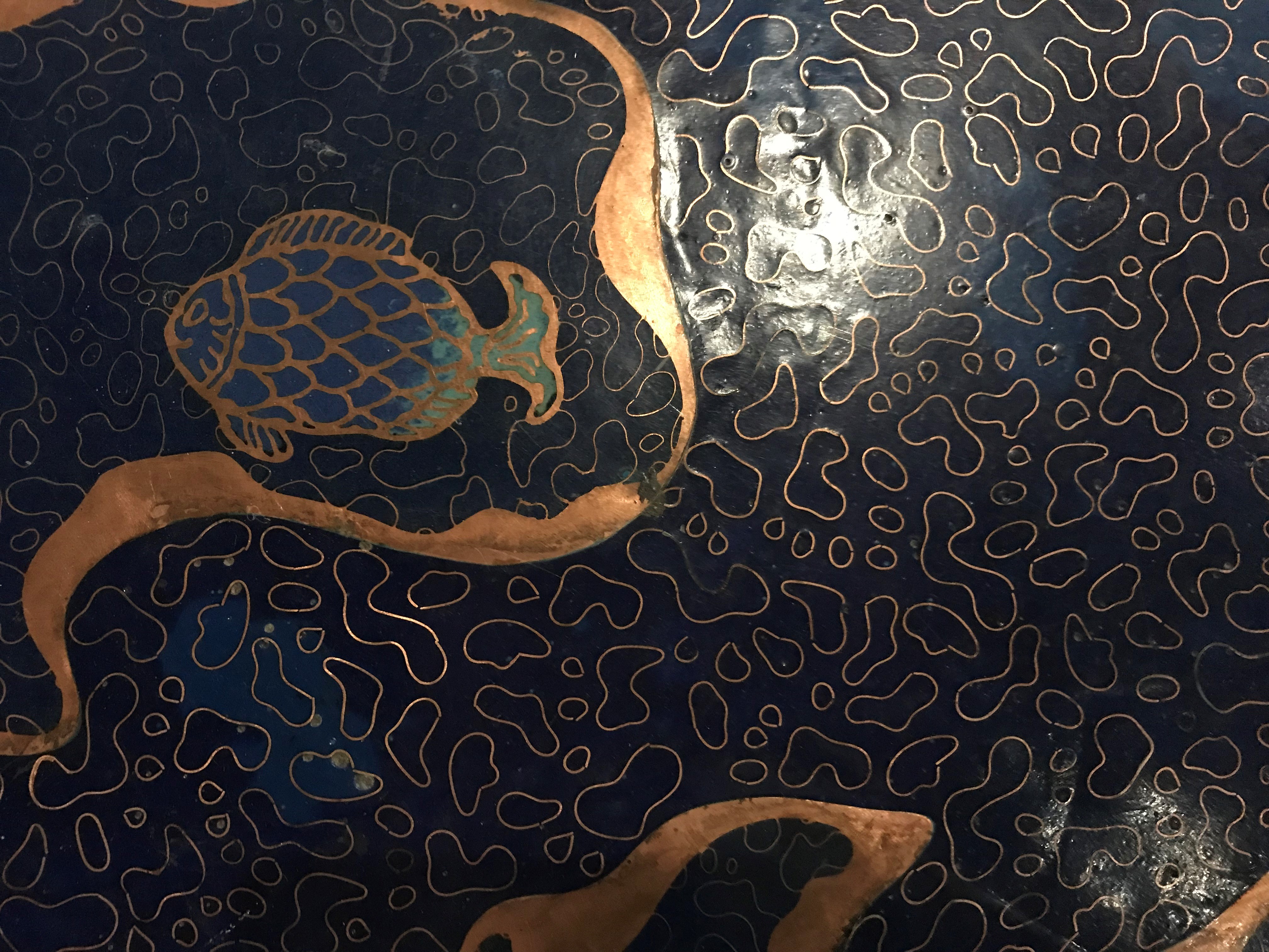 参观在讲解员的引领下正式开始。同学们先是来到了珐琅厅,这里拥有吉尼斯认证“世界最大的景泰蓝地板,480平米无缝拼接的珐琅地面,凝聚134名良工巧匠精力,耗费321681小时,采用1789653根手工掐丝,拼接1379块平面珐琅。金丝勾勒如时间年轮回旋更替,鱼和形似婴儿脚的水泡则是象征生命的轮回。