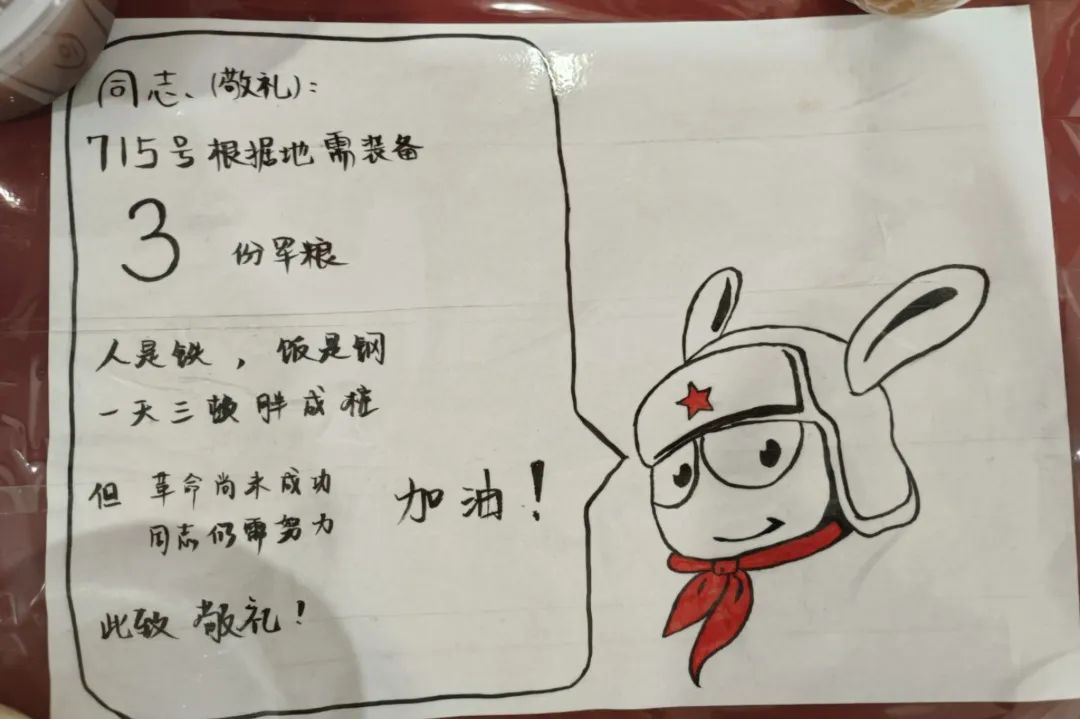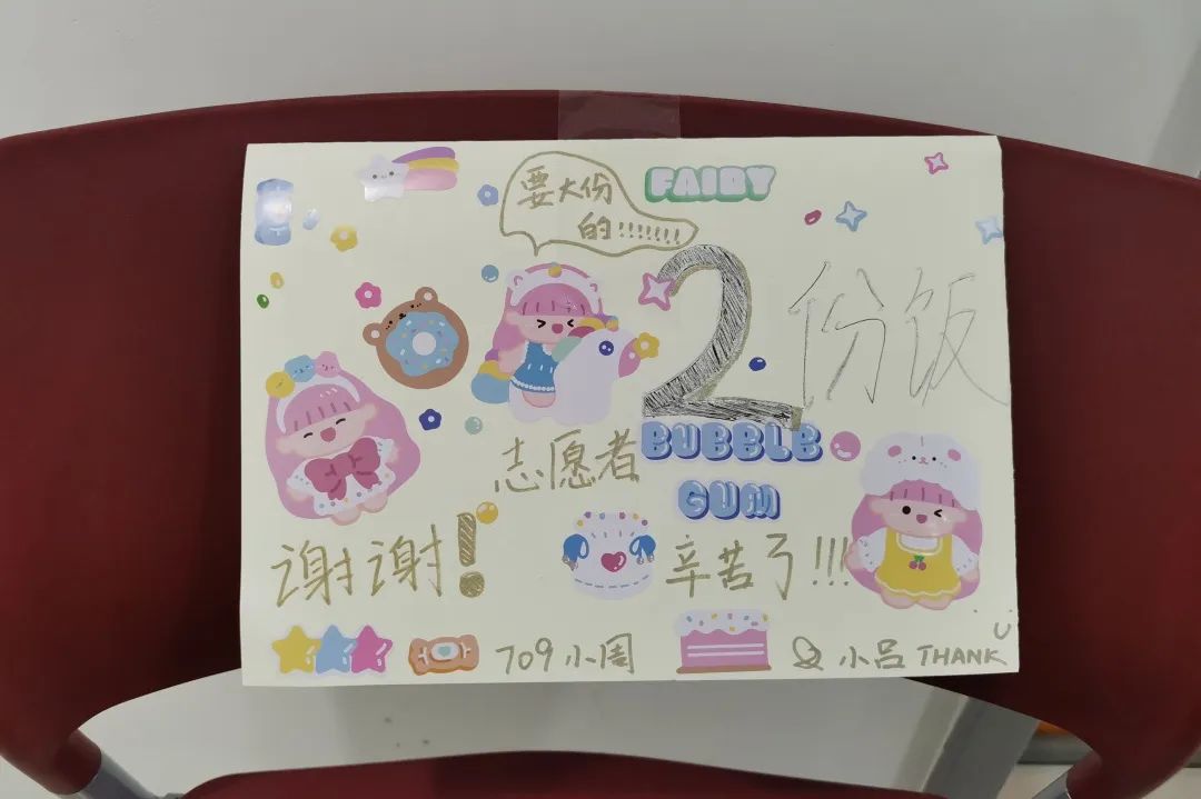公司静态管理期间,各部门师生员工辛勤付出,同学们积极配合公司相关防疫规定。创意公司学子们还积极报名组成了志愿者小分队,承担起了宿舍每一楼层的三餐发放工作。为了同学们能够吃上热乎乎的一日三餐。每天早上7:00不到,志愿者们就要穿戴好防护用品,身披志愿者马甲,推着摞满了饭盒的手推车,将饭菜按照每个寝室需求份数送至寝室门口,而每天工作的结束时间也已是大家用餐完毕之后。在送餐的过程中,我们的志愿者同学意外地发现在许多宿舍门口,寝室的同学们用绘画和贴纸细心装饰贴在门口的取餐处。上面的内容有同学们提醒志愿者同学做好自身防护,相约一起期待品尝美食、欣赏美景,憧憬未来的情感表达,这其中最多的,还是那一句句的“感谢”。