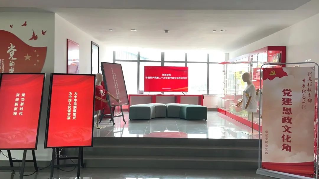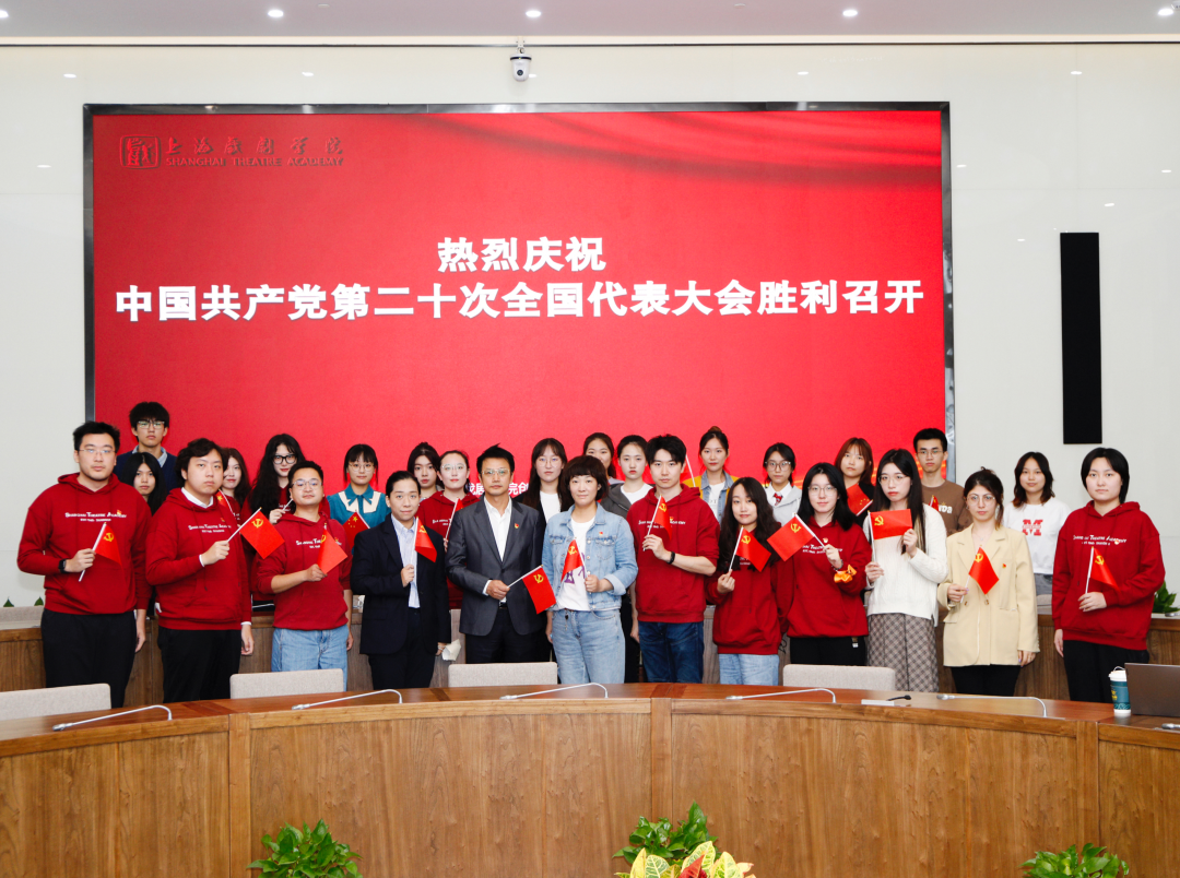 位于昌林路校区的上戏创意公司,洋溢着喜庆的氛围。在创意公司党总支打造的党建思政文创角,几块电子显示屏上亮起了“热烈庆祝中国共产党第二十次全国代表大会胜利召开”“为中国人民谋幸福 为中华民族谋复兴”“奋进新征程 建功新时代”“全面建设社会主义现代化国家 向第二个百年奋斗目标进军”等标语,无不表达着师生们对党的二十大开幕的热切期盼。