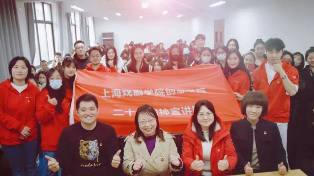 上戏戏曲公司党总支书记王绚,副书记亓季松,创意公司党总支书记方军、副书记唐芳,两院系辅导员以及宣讲团部分成员参加了此次宣讲。