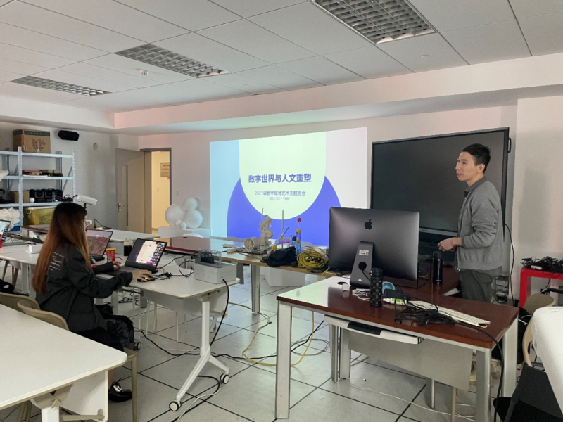 在已是大三年级2021级数字媒体艺术班主题班会上,戴老师围绕“数字世界与人文重塑”主题,总体概括了同学们目前在数字媒体专业学习的分类与导向,就三年级同学们未来准备进入毕业季前的毕业作品准备及未来职业规划做了介绍,引起同学们的广泛讨论。同学们就当前未来课程安排期望、各自的毕业作品方向规划做了阐述。会上,通过讨论,同学们还就数字媒体艺术专业的课程提出自己的看法和建议。