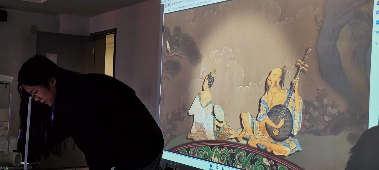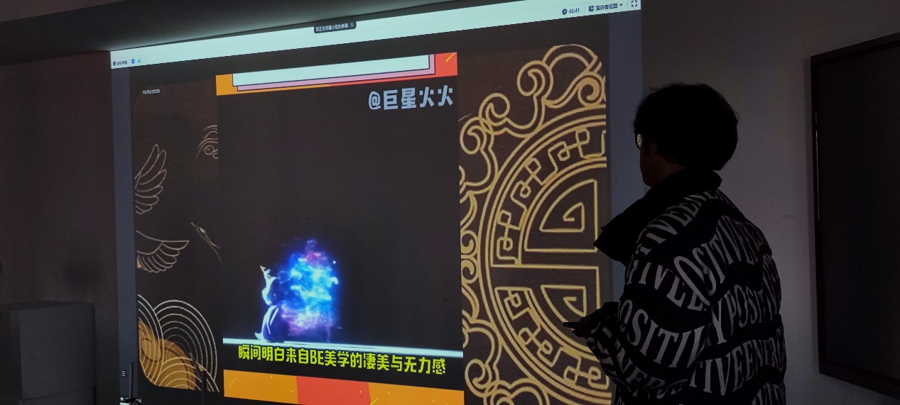 23级张伊晏妮同学分享了“千年调”流媒体,介绍如何利用动画技术再现生动的传统绘画及其中人物、物件、元素的交互及其科普、高清图信息等。