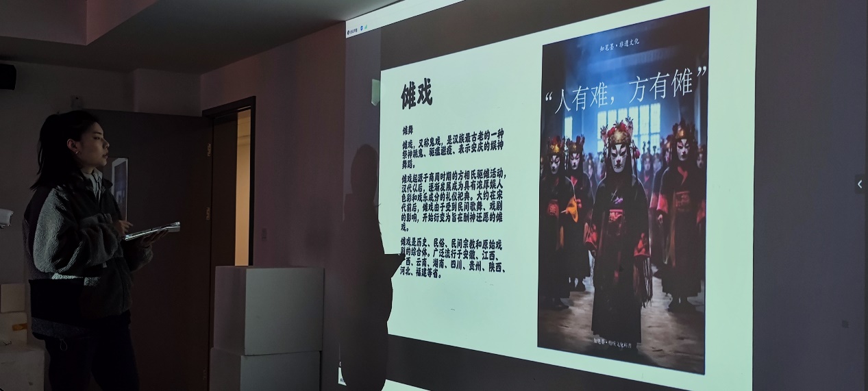 23级王子悦同学分享了闵台地区中傩戏在当代的数字化创作及数字建模榫卯游戏对于传统工艺的传播。
