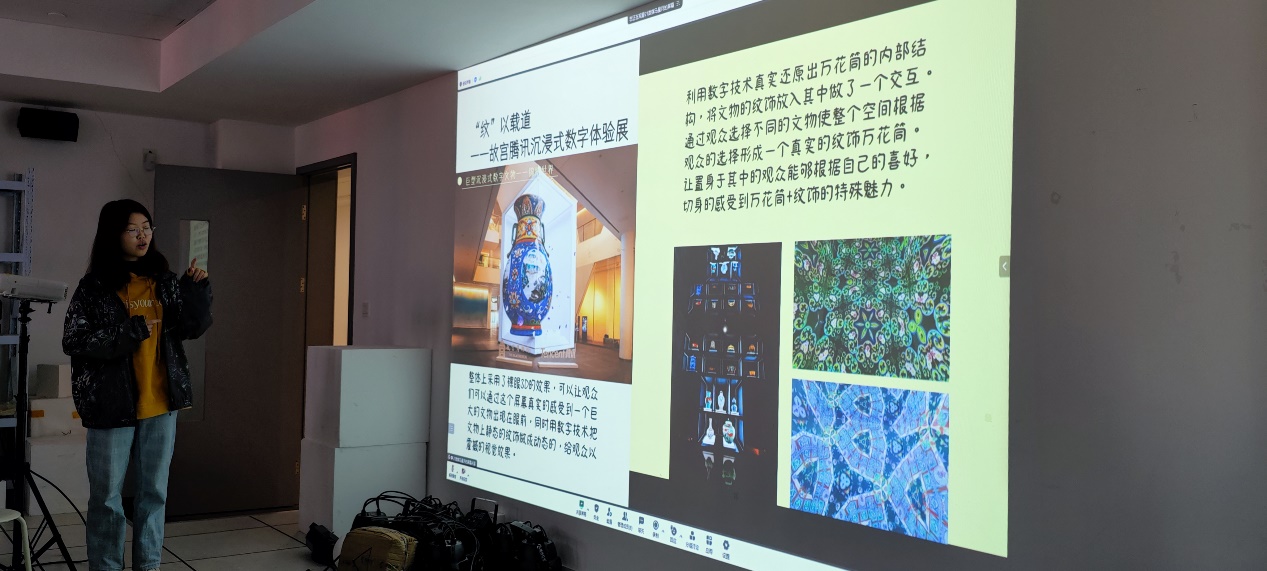 21级马星月同学分享了故宫沉浸体验展的案例,内容包括还原倦勤斋的数字还原,裸眼3D的巨大动态花瓶,四季红墙等等,向同学们传播数字媒体复原再创作文物视觉的魅力。