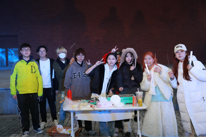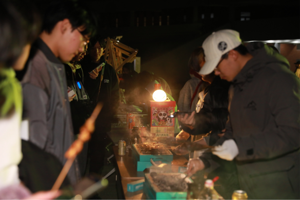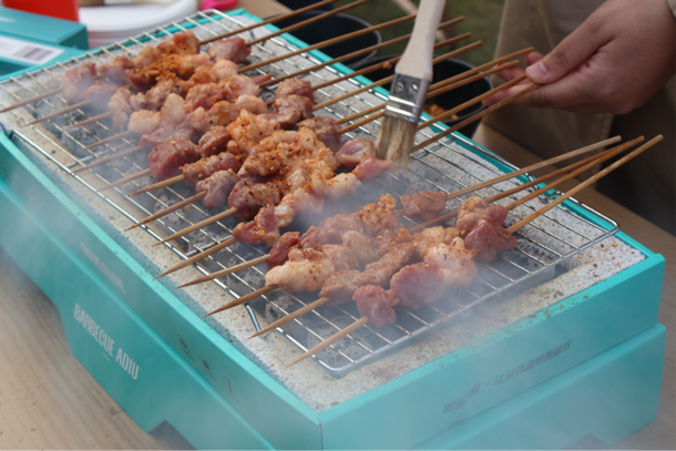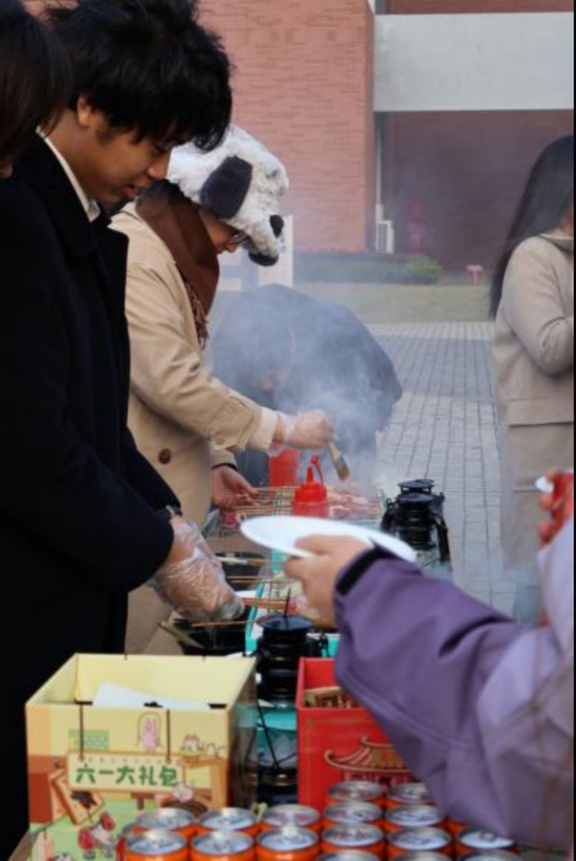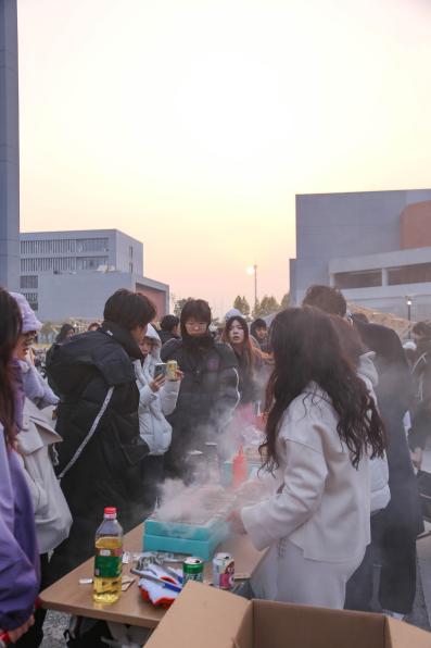 烧烤区充满着“烟火气”的烧烤架吸引着同学们的目光。负责烧烤区的同学摆上准备好的食材,烤好的食物散发阵阵香气。在同学们的欢笑声和热闹的谈话声中,火热的美食温暖了秋日的凉意。