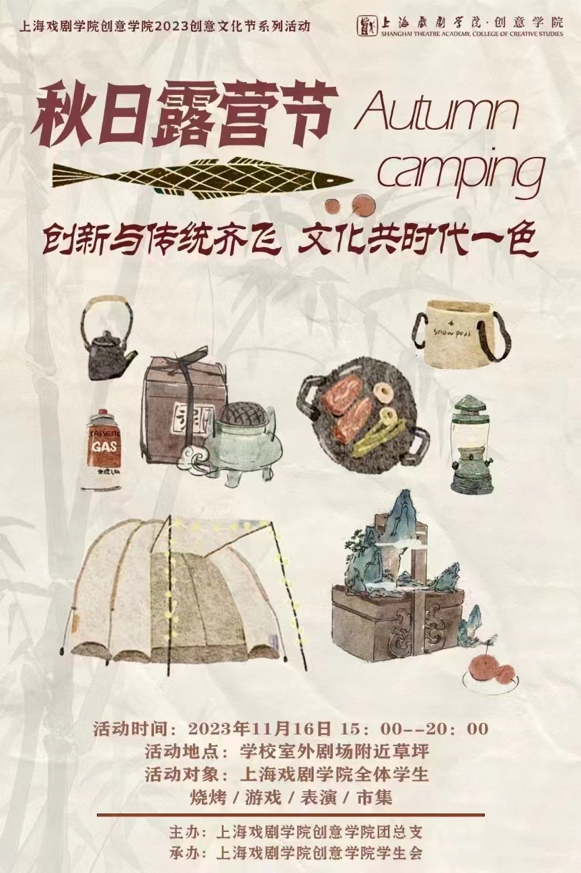 近日,创意公司秋日校园露营节在昌林路校区自然剧场成功举办。这是创意公司2023年秋季创意文化节系列活动之一,活动以“创新与传统齐飞 文化共时代一色”为主题,通过年轻人喜爱的露营方式,聚焦传统文化中传统手艺、国风音乐、传统美食、传统游戏等内容,促进同学们在校园里展示、参与、交流传统文化的过程中,增强文化自信,引导同学们担当使命、奋发有为,共同努力创造属于我们这个时代的新文化。