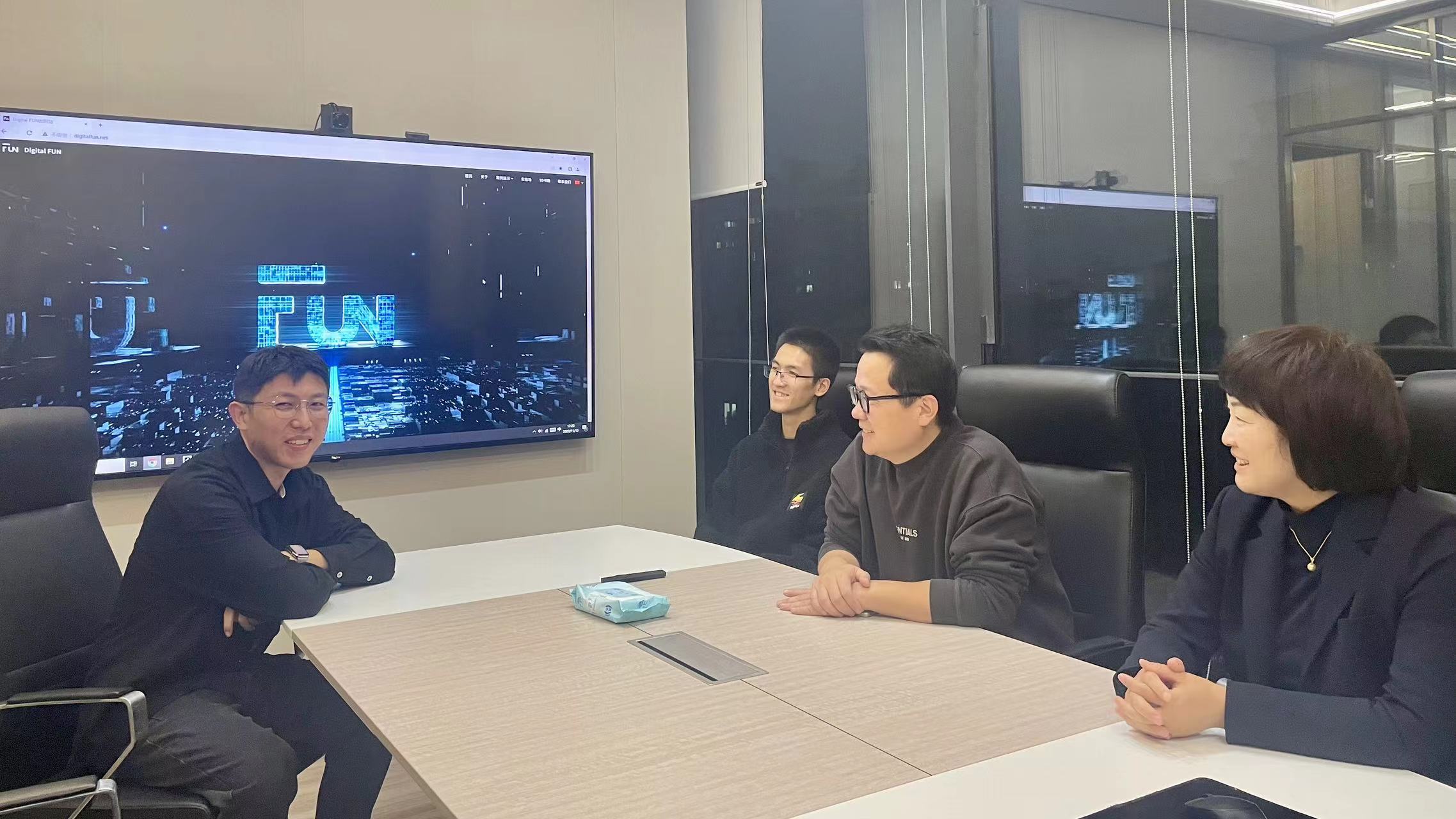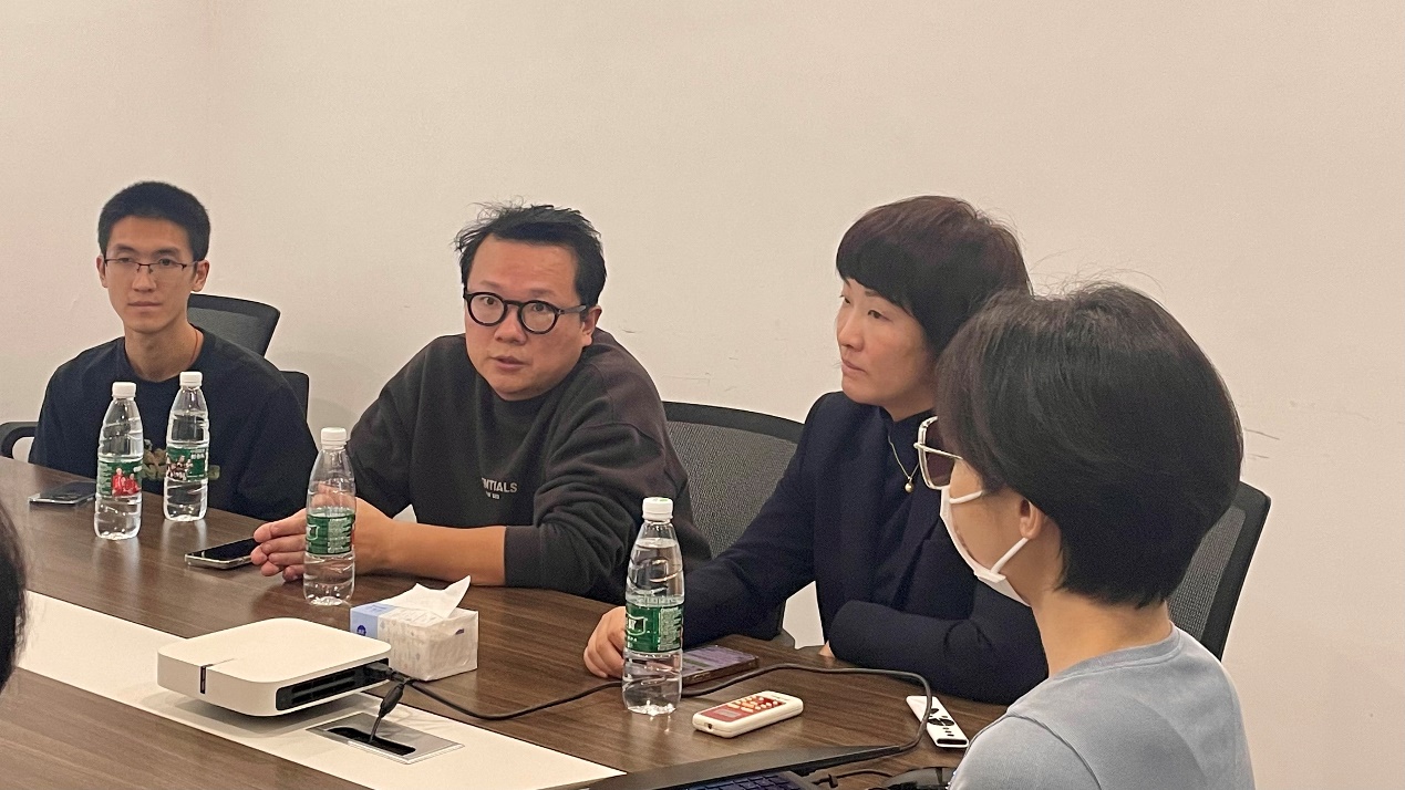 上海炳鸿信息科技有限公司CEO陈若琨和上海降世网络科技有限公司合伙人黄韵泷热情接待了创意公司师生一行,并对各自企业发展历程、发展规模、技术领域、人才需求等情况作了详细介绍,与创意公司代表进行了交流。唐芳、铁钟分别介绍了访企拓岗促就业的背景,公司人才培养特色,实验室概况等,表示希望加强与企业合作,打造人才培养、产教融合的平台,促进毕业生高质量就业。