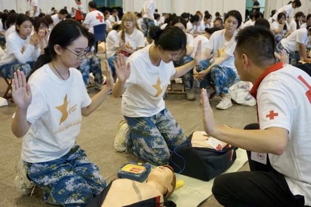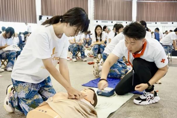 上海市红十字急救中心 战场医疗救护:战场医疗救护的课程,不仅是知识的传授,更是生命的守护。上海市红十字急救中心的专业指导,让同学们掌握了在紧急情况下救助生命的技能。他们认真学习了心肺复苏配合使用 AED的方法,掌握了各种包扎技巧。这不仅增强了他们的自我保护意识,更培养了关爱他人、拯救生命的人道主义精神。