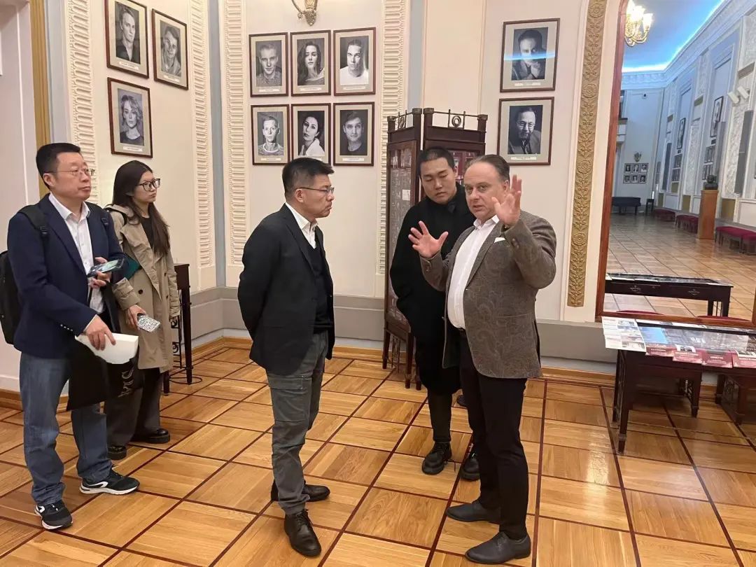 代表团首先造访了位于莫斯科的瓦赫坦戈夫剧院,与剧院总经理基里尔·克罗克见面,并在其陪同下参观了瓦赫坦戈夫剧院的剧场和历史展厅,深入了解了剧院深厚的戏剧传统和独特的文化氛围。瓦赫坦戈夫剧院以其精湛的传统经典剧目演出和对新兴戏剧人才的大力扶持而闻名遐迩,剧院内部配备了多样化的舞台和工作室设施,包括新舞台、工作室、艺术咖啡厅和西蒙诺夫剧院,为年轻艺术家们提供了广阔的创作和展示平台。代表团还观摩了著名导演图米拉斯执导的经典话剧《俄狄浦斯王》,体验了剧院卓越的艺术水准和深邃的戏剧内涵。