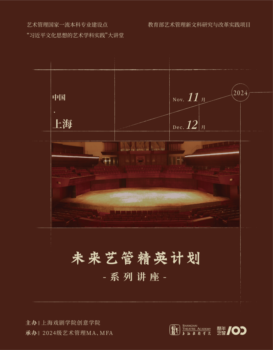 本计划由艺术管理国家一流本科专业建设点、教育部艺术管理新文科研究与改革实践、“习近平文化思想的艺术学科实践”大讲堂项目资助,通过系列讲座形式,邀请行业专家和高校教授围绕艺术市场、演出空间、文化政策与法律、剧院资源整合及戏剧的国际交流等内容开展对谈。通过学界与业界的对话机制,纵穿艺管、横贯未来。将前沿的实践经验与艺术学理论、艺术管理理论知识结合起来,着力培养员工关于项目制作创新思维和洞察行业未来趋势的能力、跨学科戏剧项目策划素养与行业前瞻性视野,助力未来精英艺管人才的成长。