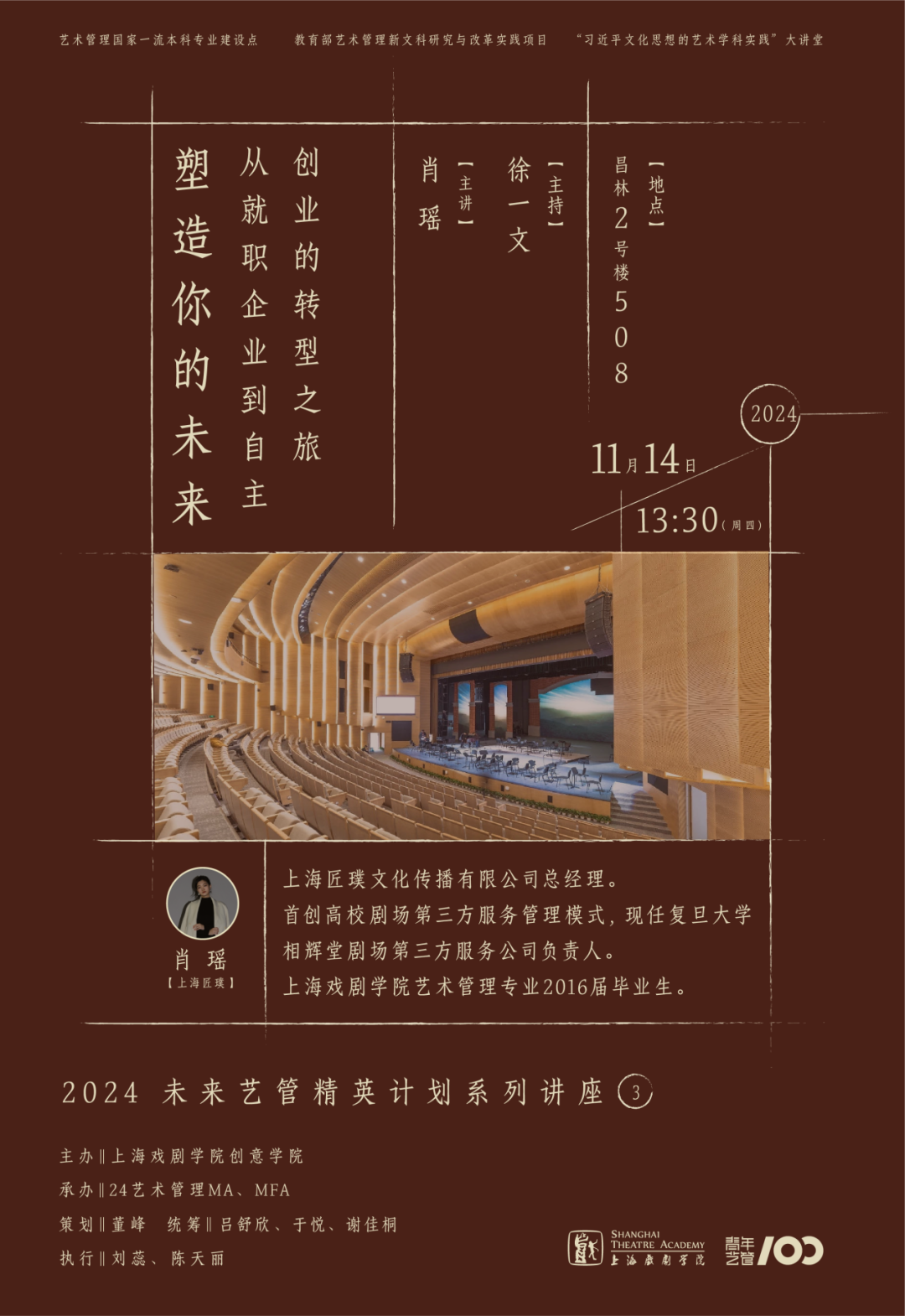 2024 年 11 月 14 日下午,业内知名剧场管理人肖瑶老师应邀来到太阳成tyc122cc集团昌林路校区,为同学们带来了一场题为“从就职企业到自主创业的转型之旅”的精彩讲座。肖瑶老师结合自身从上海话剧中心到复旦大学相辉堂,再到创立高校剧场服务团队的职业经历,深入剖析了职场选择对职业发展的关键作用,并介绍了她团队在高校剧场领域的实践创新。以下是讲座的核心内容回顾。