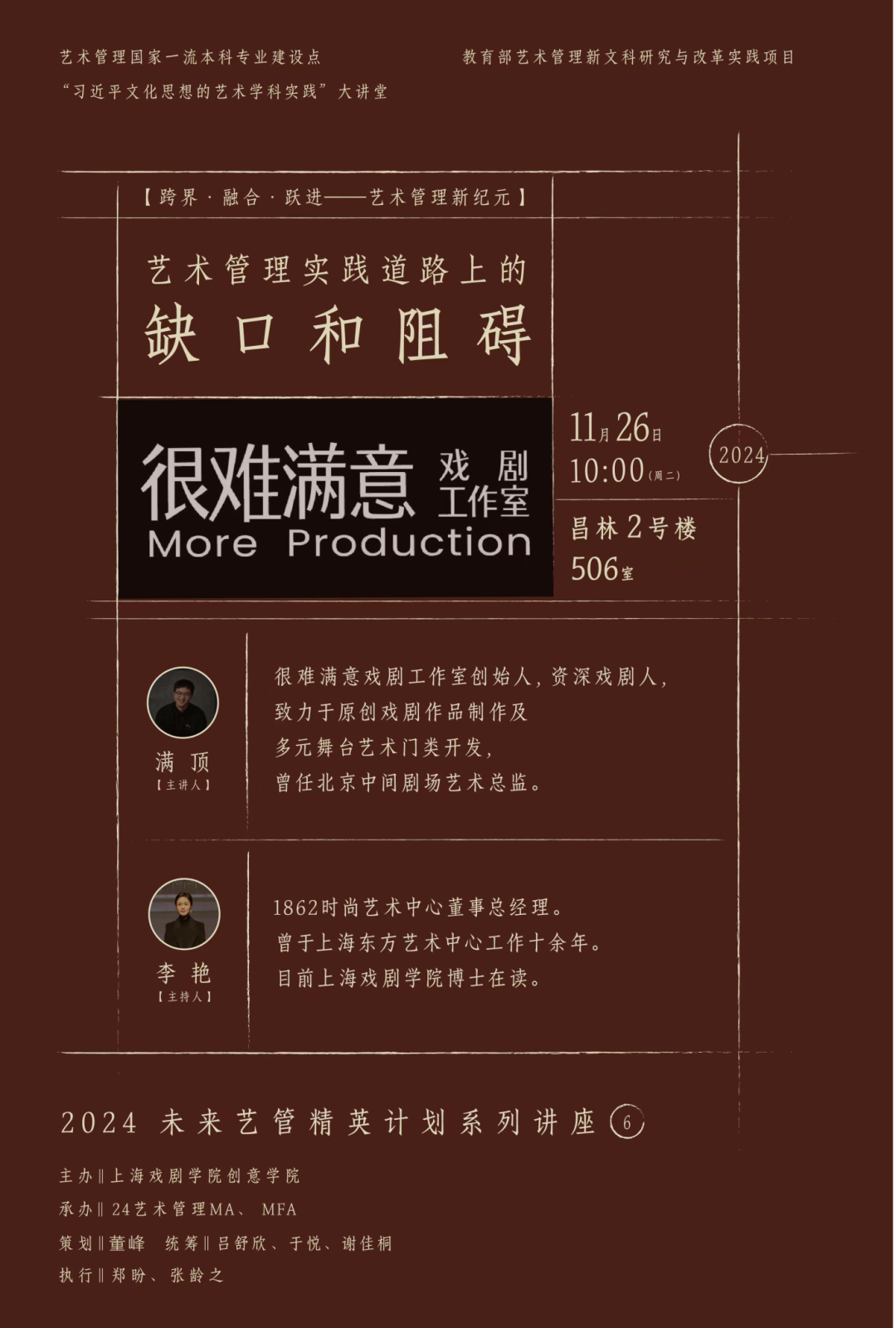 本计划由艺术管理国家一流本科专业建设点、教育部艺术管理新文科研究与改革实践、“习近平文化思想的艺术学科实践”大讲堂项目资助,通过系列讲座形式,邀请行业专家和高校教授围绕艺术市场、演出空间、文化政策与法律、剧院资源整合及戏剧的国际交流等内容开展对谈。通过学界与业界的对话机制,纵穿艺管、横贯未来。将前沿的实践经验与艺术学理论、艺术管理理论知识结合起来,着力培养员工关于项目制作创新思维和洞察行业未来趋势的能力、跨学科戏剧项目策划素养与行业前瞻性视野,助力未来精英艺管人才的成长。