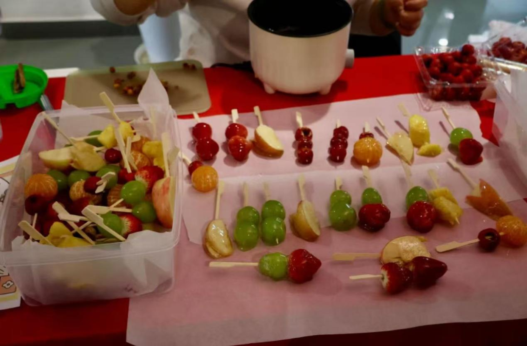 齐享传统美食创意市集的小吃区则给大家带来了一场美食盛宴,糖葫芦的红亮酸甜、棉花糖的梦幻绵软、热饮的香浓暖人,交织成一首舌尖上的温暖旋律。随着缕缕烟火袅袅升起,校园中弥漫着诱人的香气,让同学们在欣赏体验文创产品的同时感受属于美食的温暖。