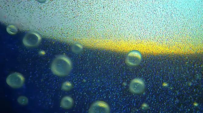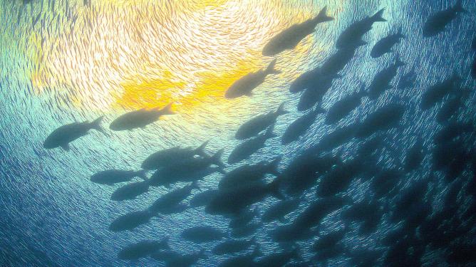 指令:风格不变,多一些笔触。镜头缓缓下沉并向后移动,沙丁鱼群从右上角游入画面紧密排列成旋涡状在眼前快速游动,气泡从底部持续上浮逐渐稀疏,中心区域的圆形光斑随着镜头移动变得遥远而微弱,深蓝海水中光线呈现出柔和的散射效果。