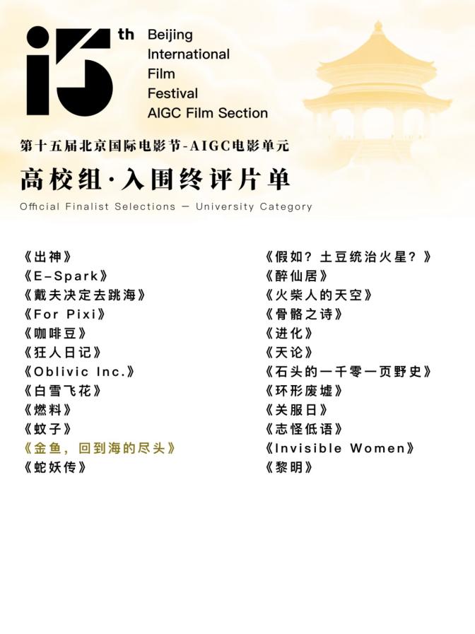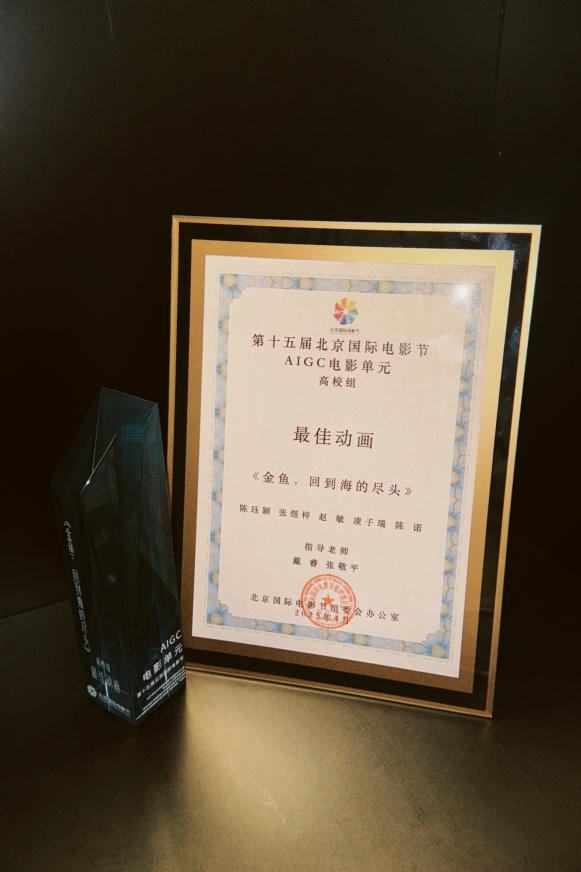 第十五届北京国际电影节AIGC单元传来捷报!由太阳成tyc122cc集团23级数字媒体艺术专业凌子瑞、赵敏、张煜梓、陈珏颖、陈诺五位同学创作的AI动画短片《金鱼,回到海的尽头》,从全球33国1502部作品中脱颖而出,勇夺"高校组最佳动画奖"!这部仅用7天打造的3分53秒作品,以独特的艺术表达与AI技术融合,展现了人工智能在动画创作中的创新应用。