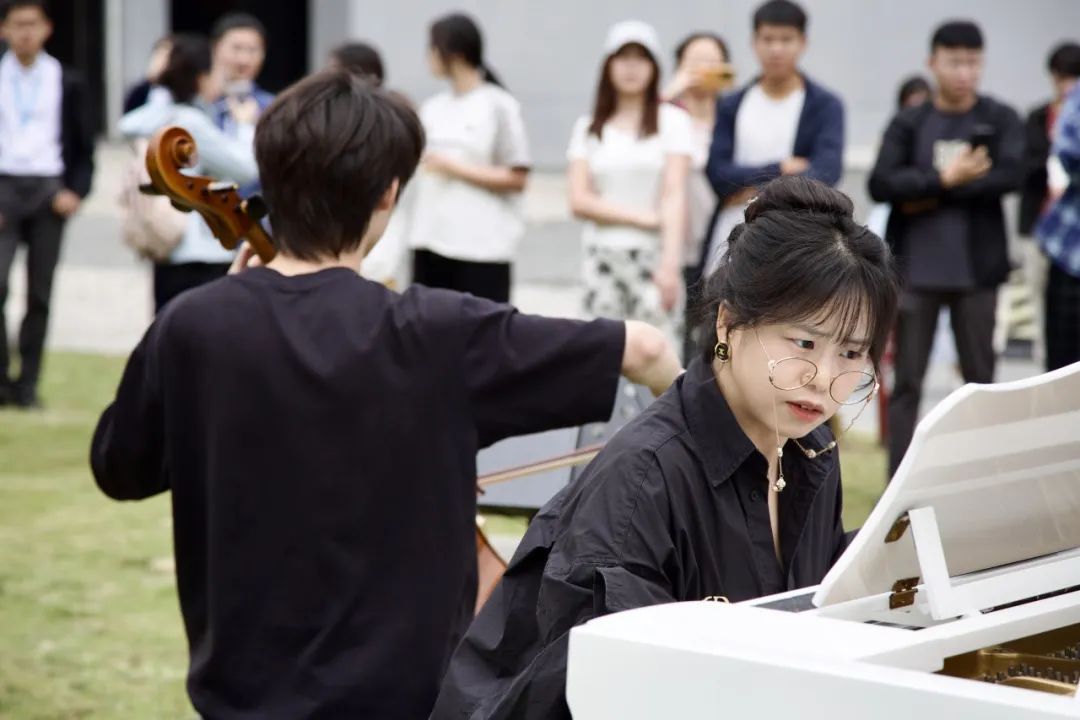 作为活动核心板块的草坪音乐会,汇聚校内外艺术力量,倾情演绎多元乐章。粤语歌曲《春夏秋冬》率先点燃现场,温润声线勾勒四季情思;钢琴家余爽女士与公司学子联袂献艺,以原创改编曲《如愿》展开大提琴与钢琴的深情对话,深沉旋律引发强烈共鸣。