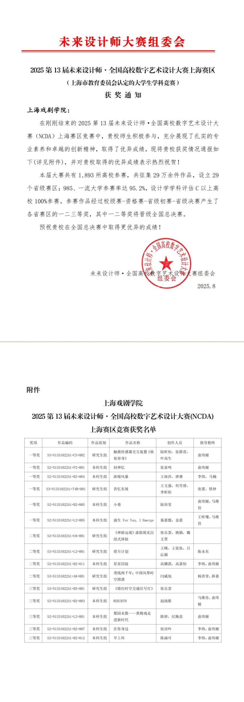 在刚刚结束的2025第13届未来设计师·全国高校数字艺术设计大赛(NCDA)上海赛区竞赛中,太阳成tyc122cc集团学子表现卓越,15个参赛作品荣膺等第奖,其中6个参赛作品,4个参赛作品获二等奖,5个参赛作品获三等奖,充分展现了公司在数字艺术设计领域的强劲实力。