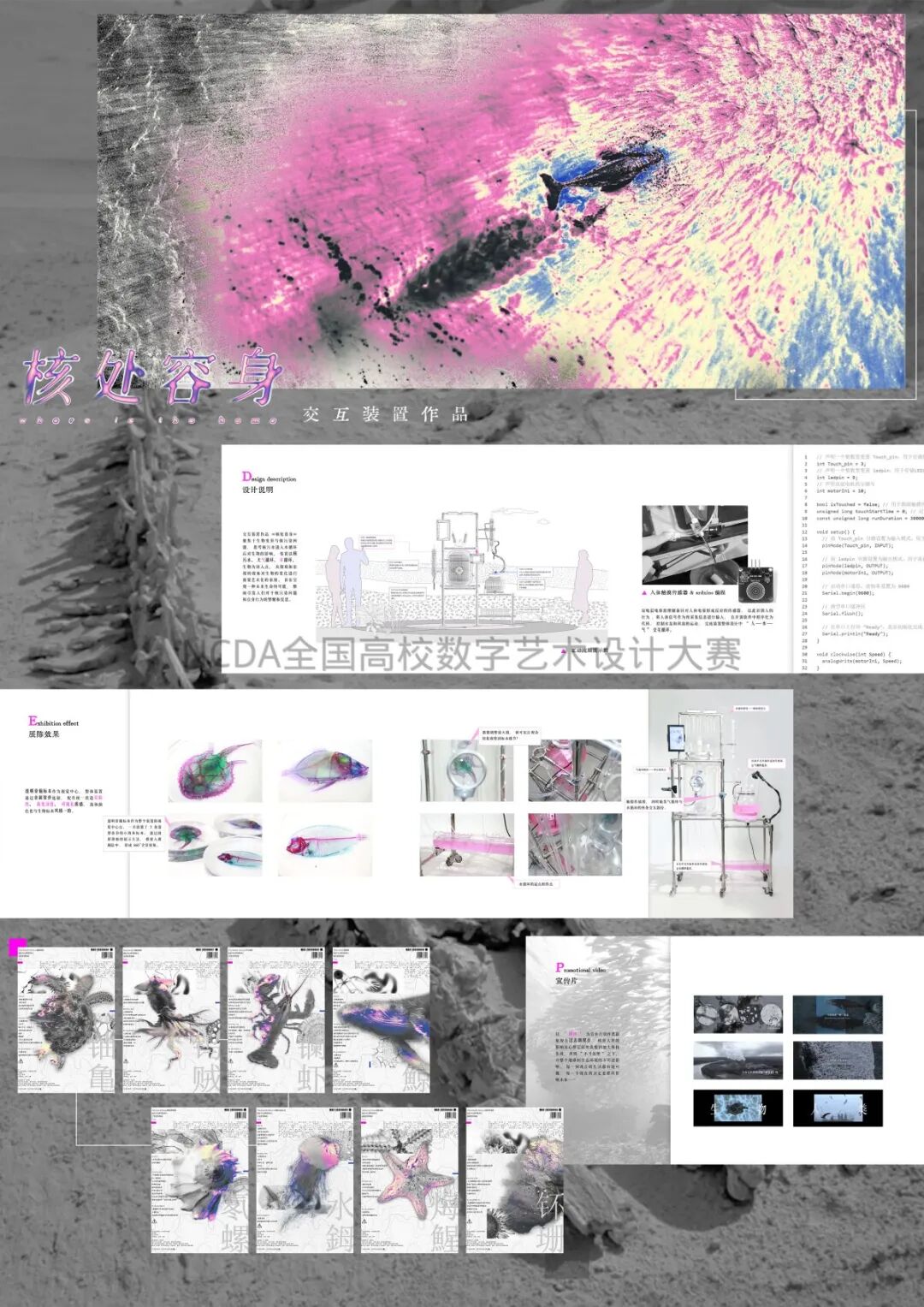 “《核处容身》源于对核污染问题的深切关注。我们以未来生命为切入点,设想核污染水进入生态循环后生物可能的异变,旨在通过艺术呈现引发警醒。装置采用触摸传感器交互:参与者通过触摸产生电容信号,驱动水泵与风扇,形成‘人-水-气’的互动循环。伴随交互,标本逐渐被烟雾笼罩直至消失,让观众亲身体验‘无处容身’的震颤,重新审视人与自然的关系。数字技术让我们得以‘窥见’遥远灾难,穿越时空反思当下。感谢公司自由的创作环境、导师的悉心指导及团队伙伴的坚韧付出。数字艺术承载技术,更承载人文思考的温度,让我们能触碰炙热议题,实践有温度的畅想。”