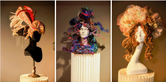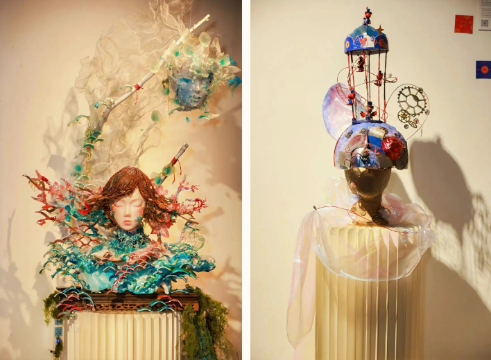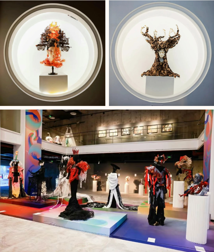 “着色·尚戏”板块由舞台美术系服装与化妆设计专业师生创作,实践与教学结合,通过项目成果展现的方式,将创意人物造型与戏剧艺术进行多维融合,凝练专业特色、彰显原创设计。在展区展出的舞台美术作品中,有从传统戏剧与文学中汲取灵感的匠心创作,如舞台人物造型设计专业员工袁满创作的《夜》,以歌剧《魔笛》中夜后角色为原型,借助综合材质重塑暗夜女王的磅礴气场。此外,也有服装与化妆设计专业员工李子欣作品《∞》,通过服饰大胆探索未来时空,以流动剪裁与循环结构演绎可穿着的诗意宇宙。