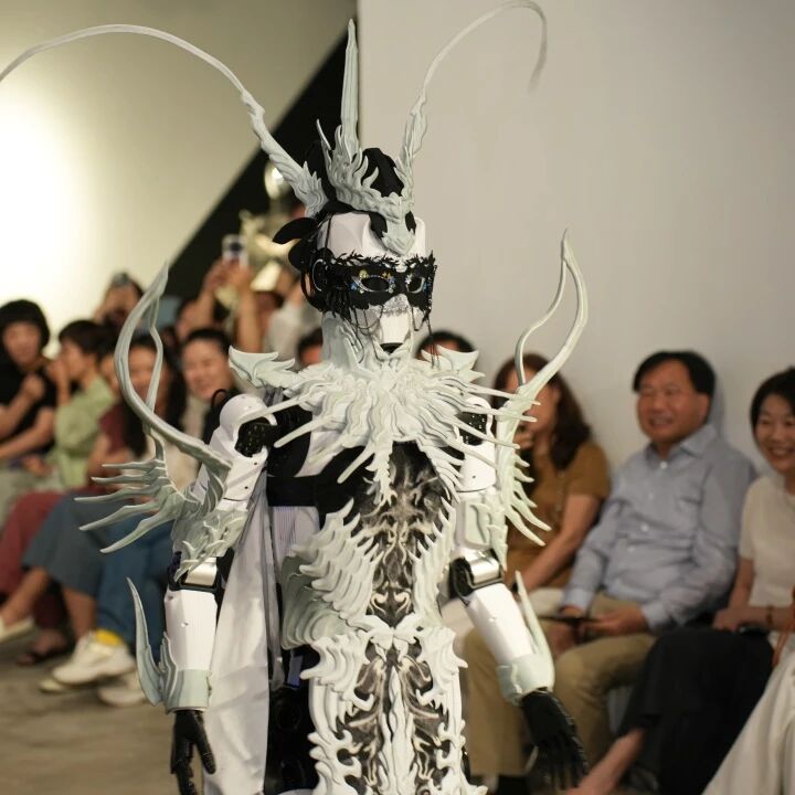 开幕式当天呈现多个亮点,“着色·尚戏”创意造型秀由16名模特共展出多个系列服饰作品,“数智·光影”板块导览环节里观众则在观赏中能亲身体验装置互动艺术等类型作品。走秀尾声,由上海理工大学、上海卓益得机器人有限公司提供的2名机器人闪亮登场。机器人们事先由舞美系的师生们进行造型装扮,他们身着本次展出的服装,与真人模特共同为嘉宾观众们带来了一场别致的演出。