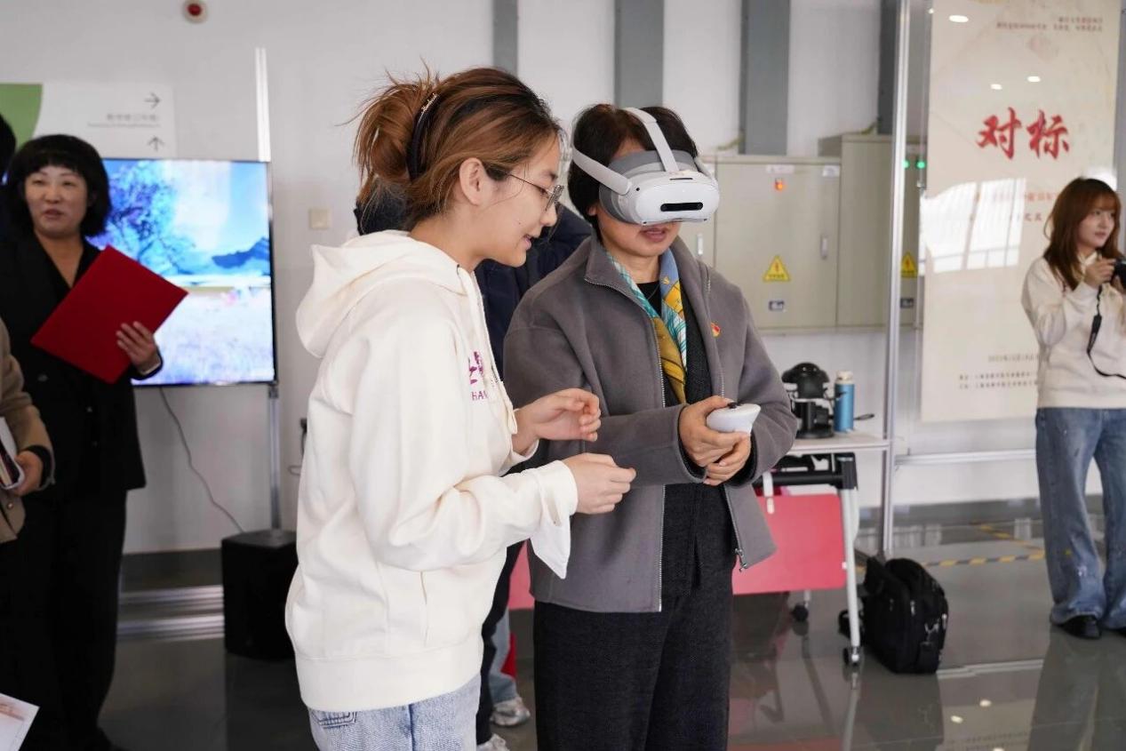 活动最后,全体人员在党总支副书记薛嘉的引导下步入展区交流观展。展览围绕教育楷模事迹,打造了手绘、影像、AI文创、VR体验四大板块。